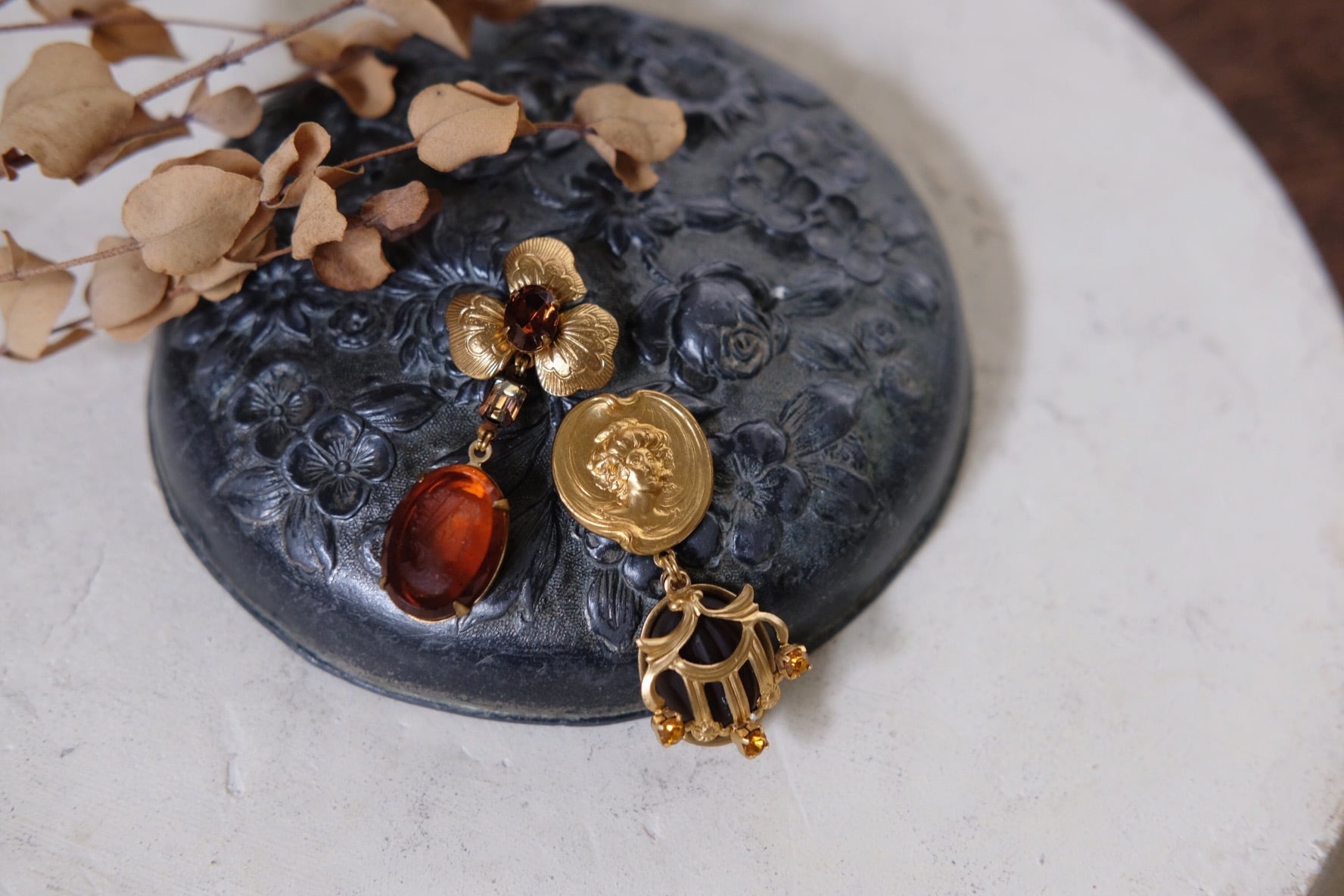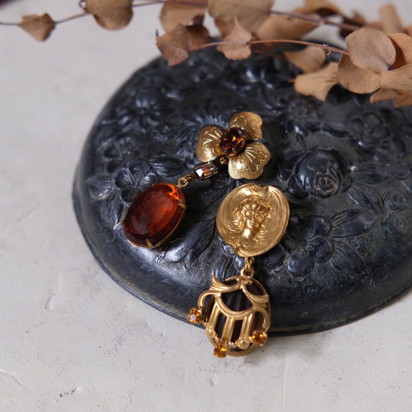 materials: 真鍮、ドイツ ガラス インタリオ カメオ、スワロフスキー、Topaz カボション