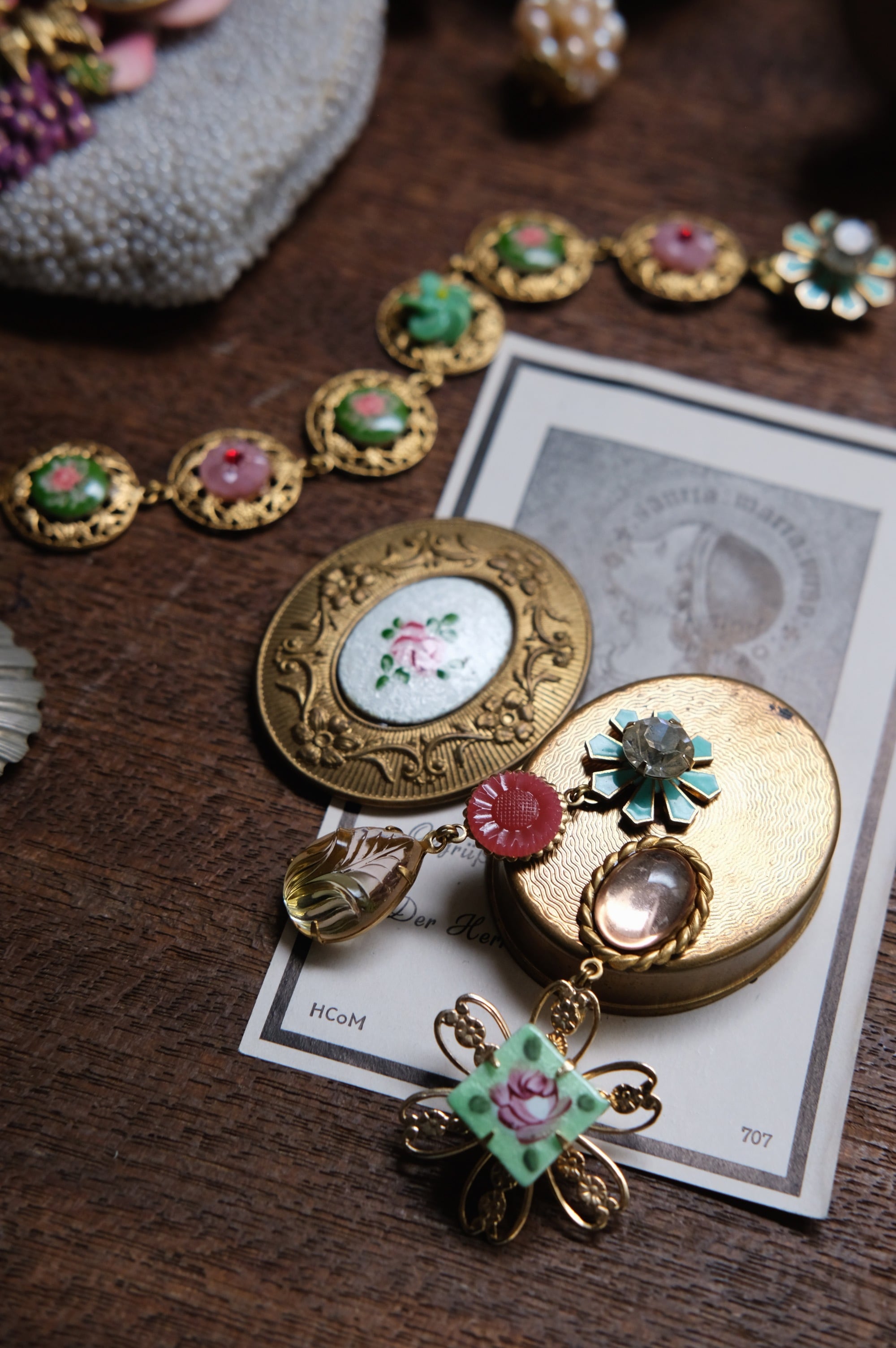 materials: 真鍮、U.S ヴィンテージ エナメル チャーム、ドイツ ヴィンテージ ガラス カボション