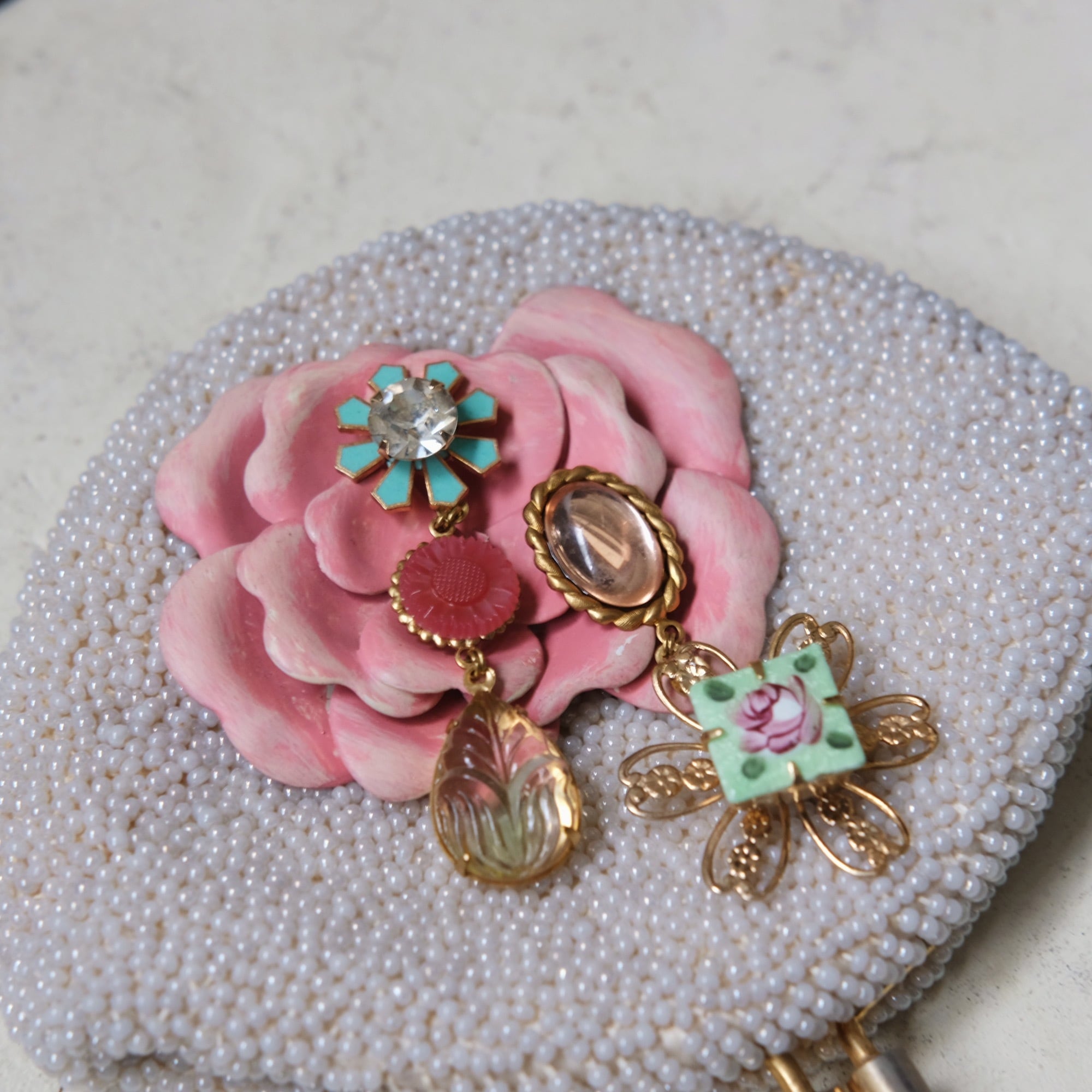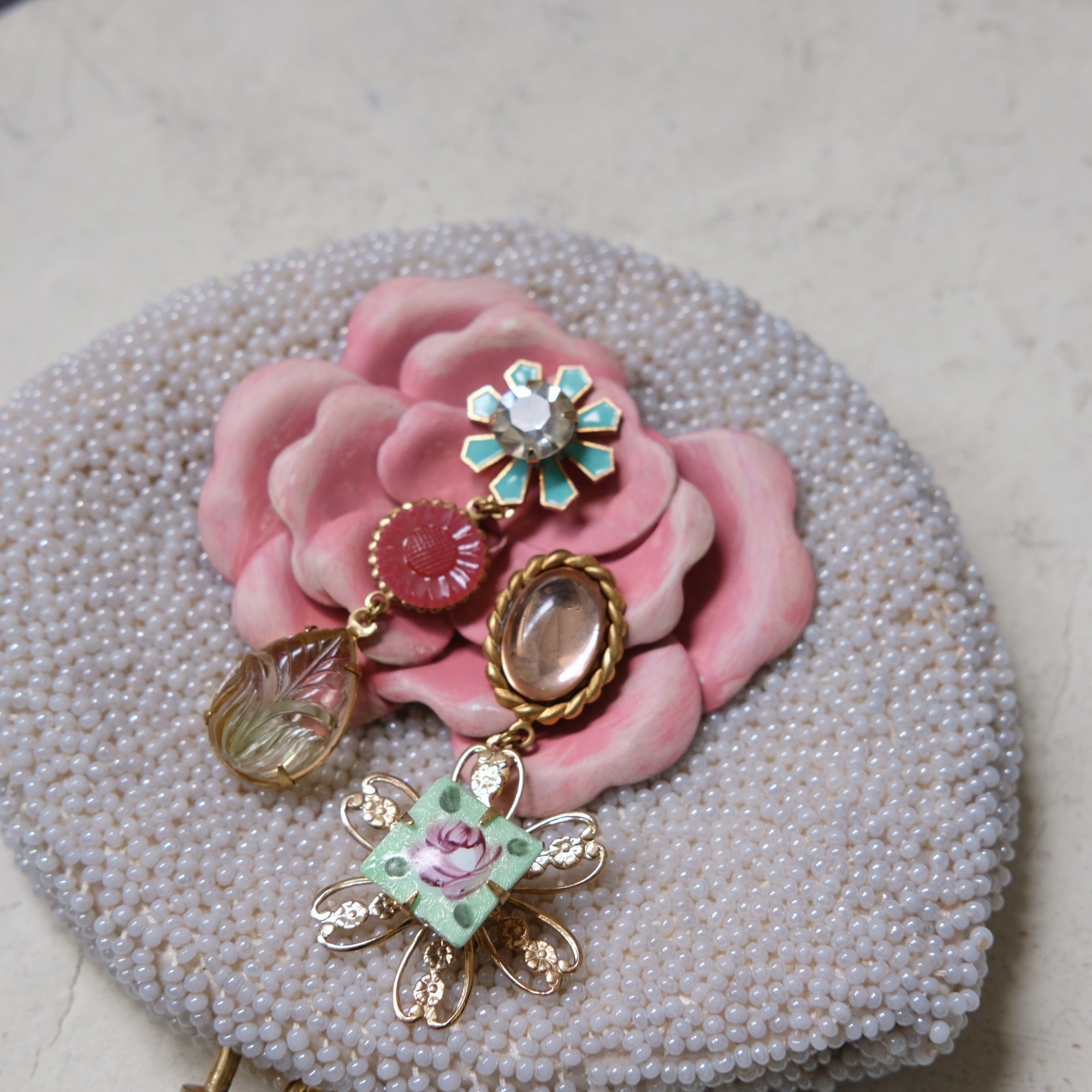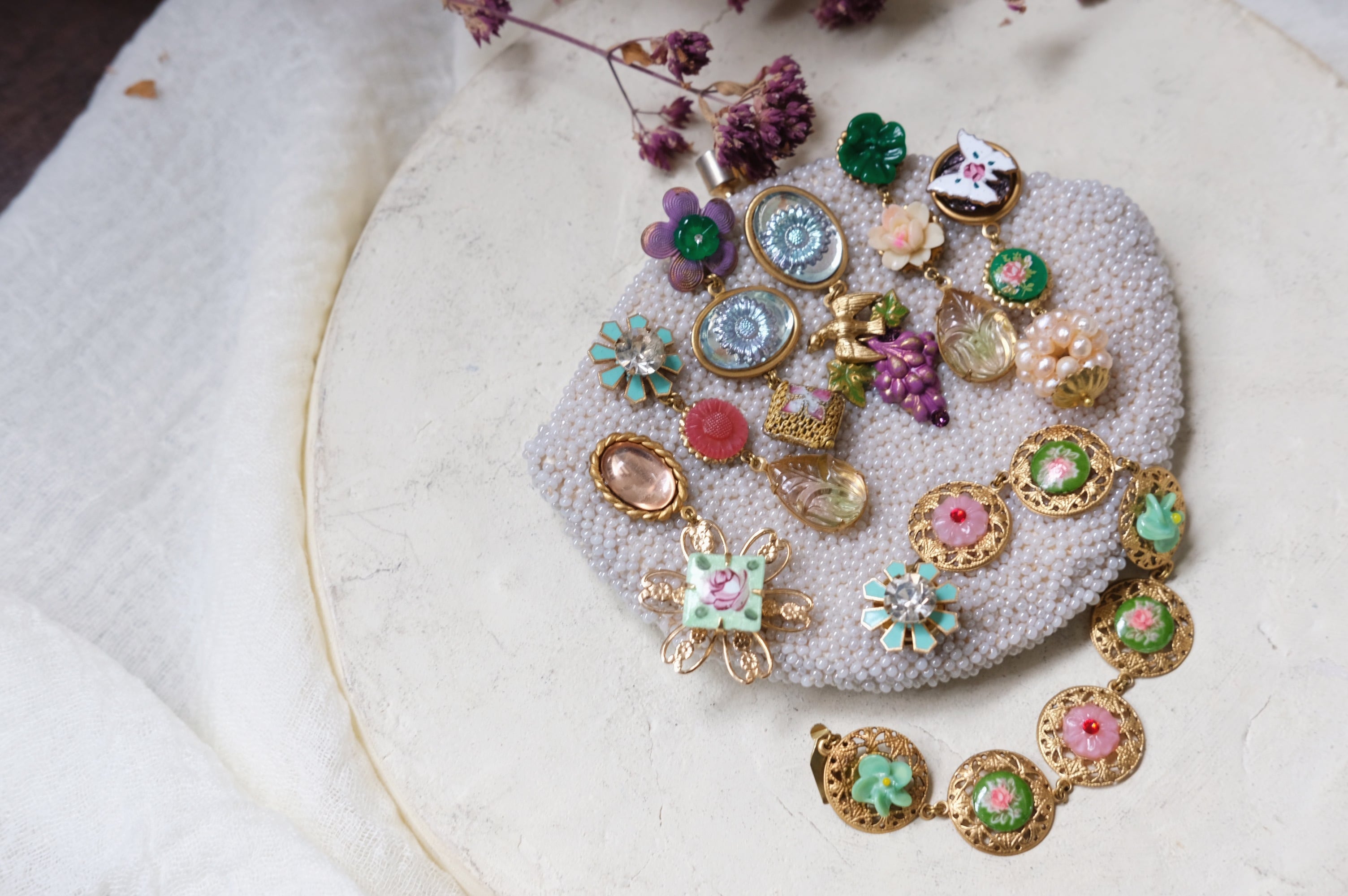 •Each piece is handmade with carefully sourced vintage materials. Because these parts are delicate and one-of-a-kind, I assemble them like a small collage using high-quality jewelry adhesive, then secure everything with resin. Most vintage components can’t be soldered, so this method helps preserve their charm while creating durable, wearable art.