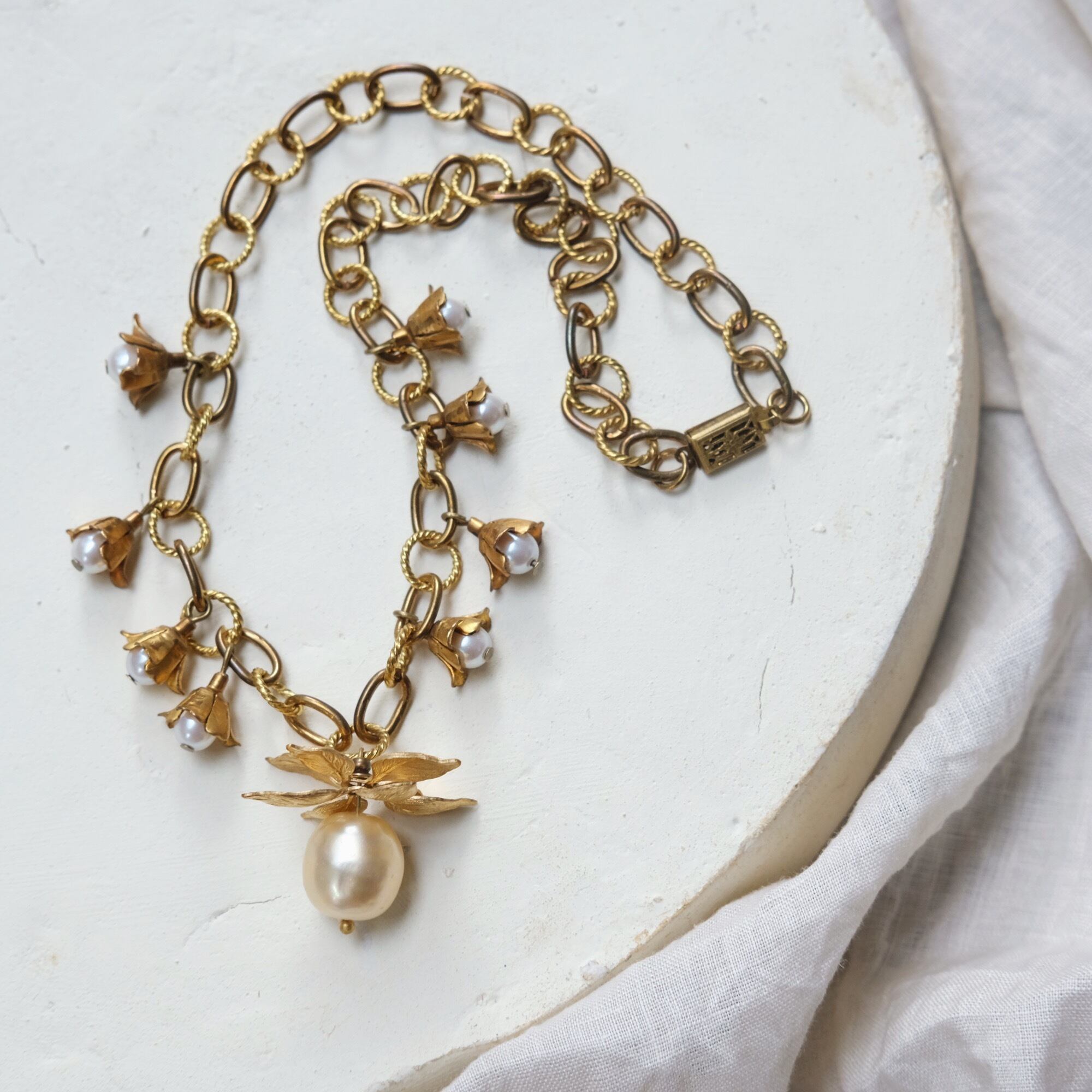 This necklace is adorned with brass flower findings and vintage faux pearls.
