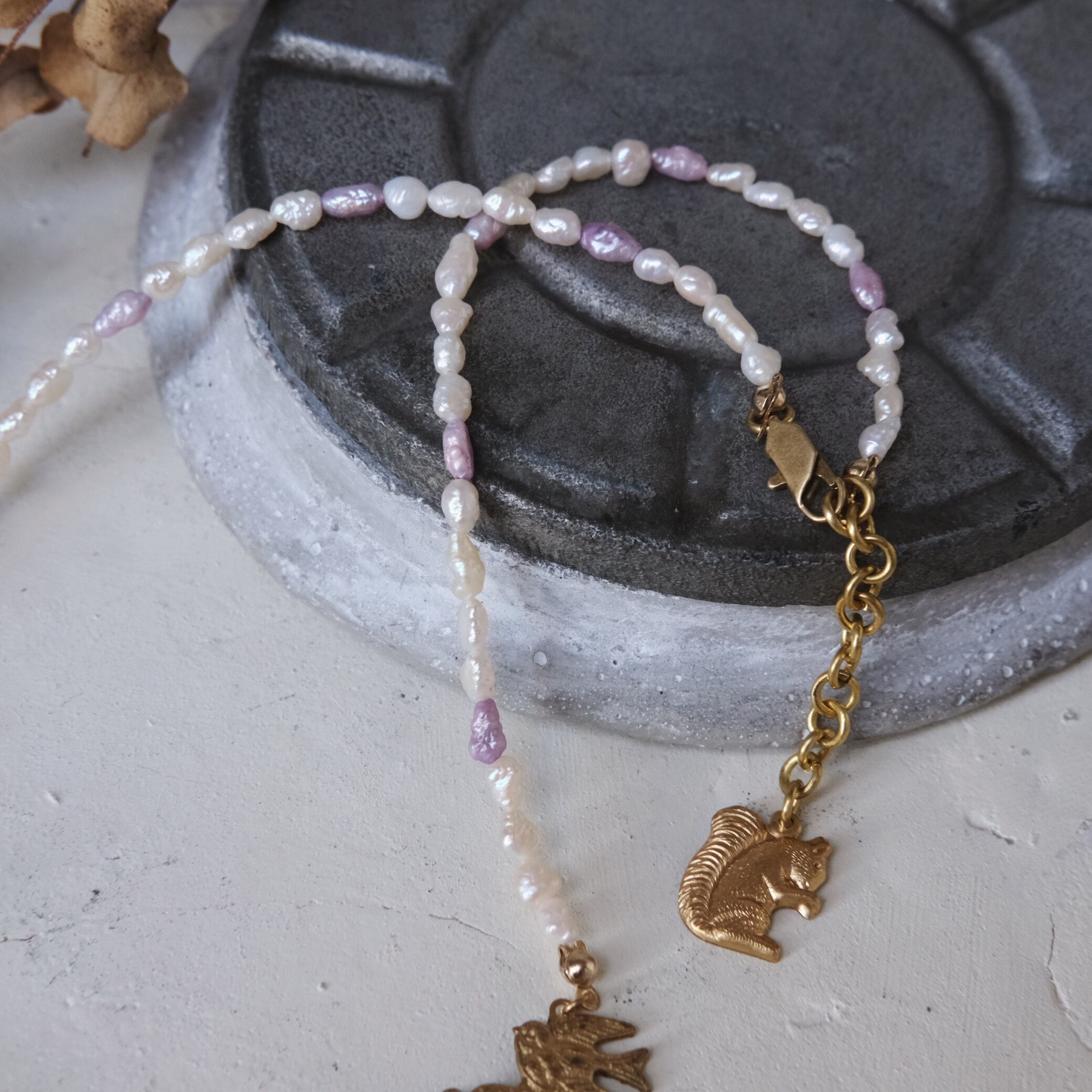 materials: 真鍮、バロックパール、マザーオブパールに手描きのキノコ 、ヴィンテージパーツ