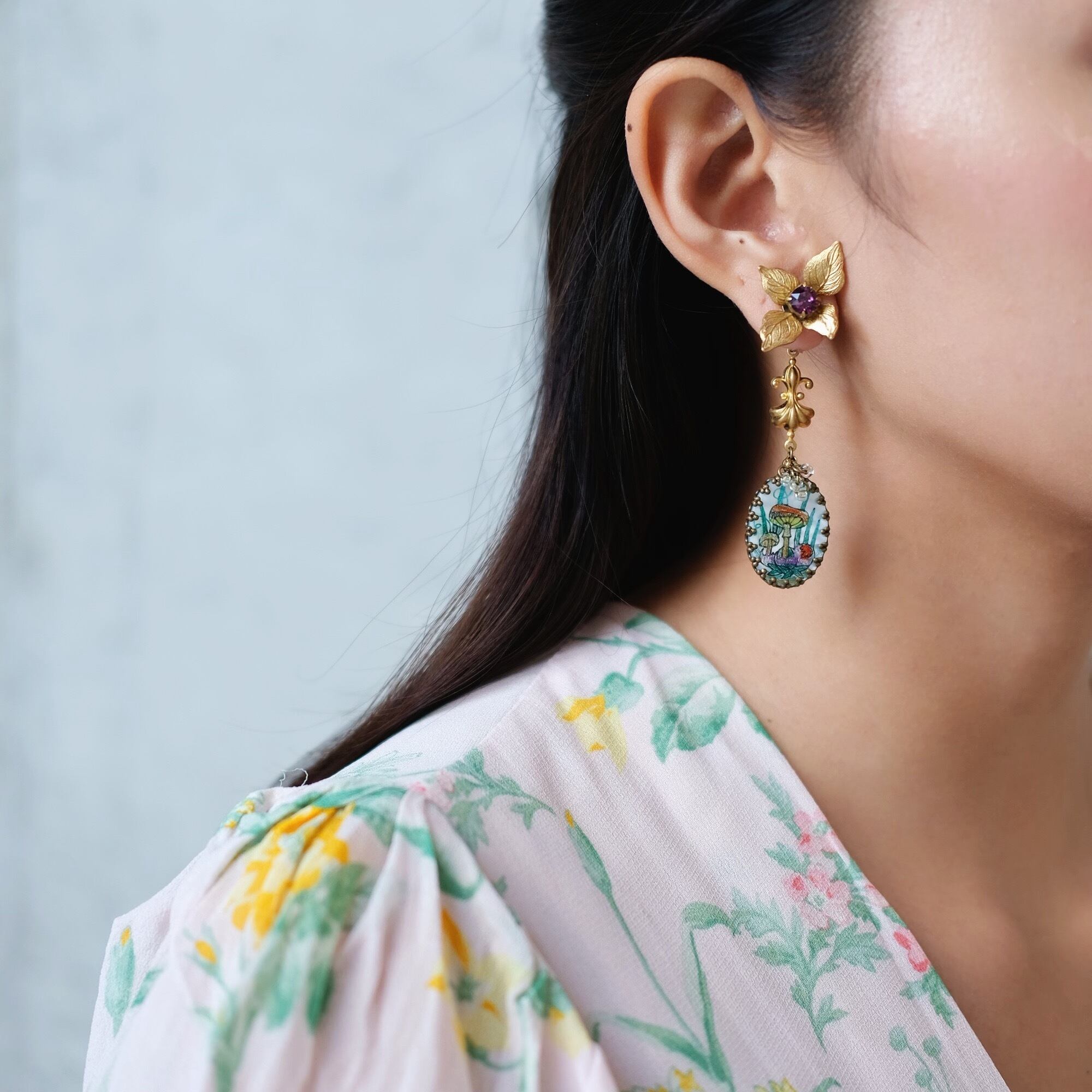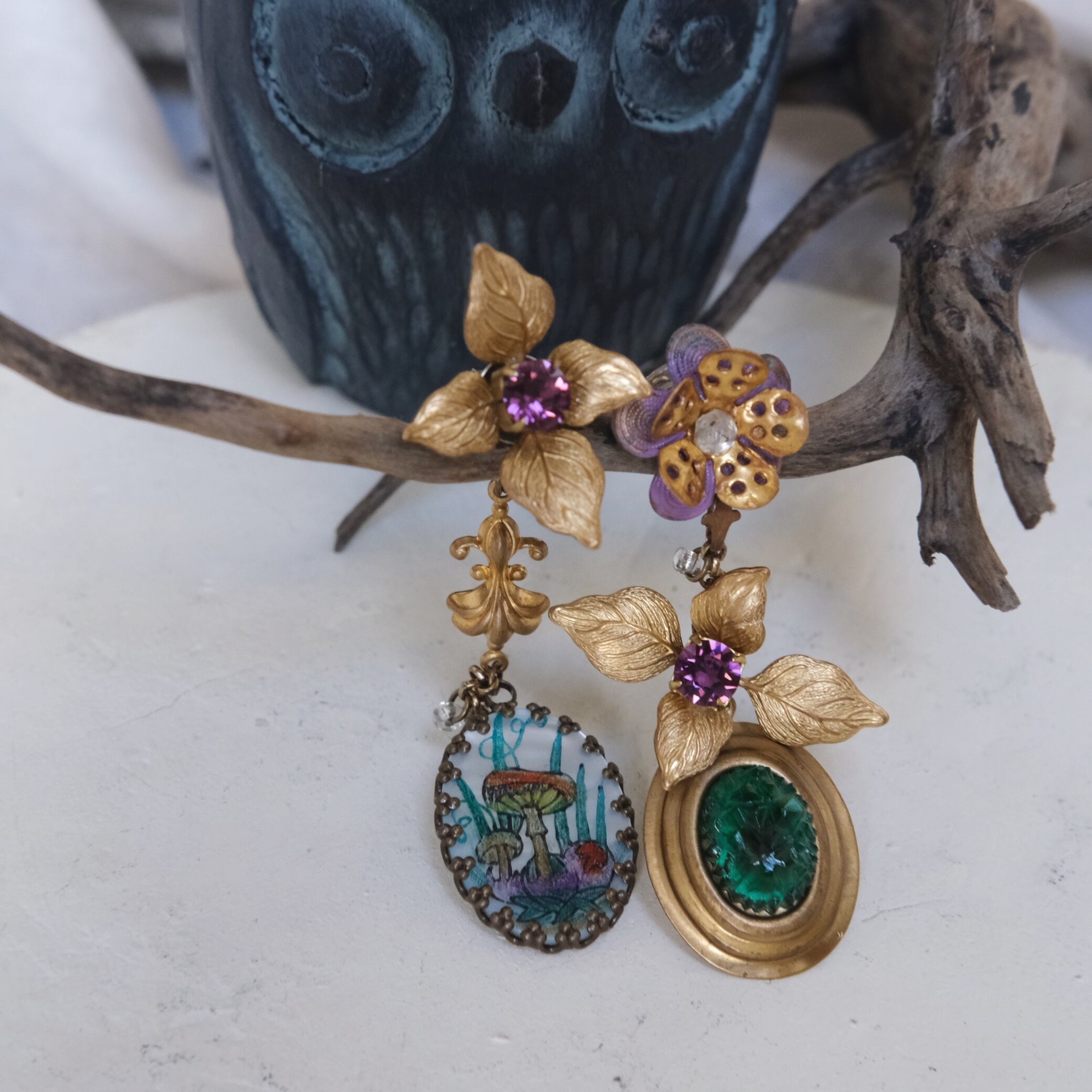 materials: : 真鍮、バロックパール、マザーオブパールに手描きのキノコ 、ヴィンテージパーツ