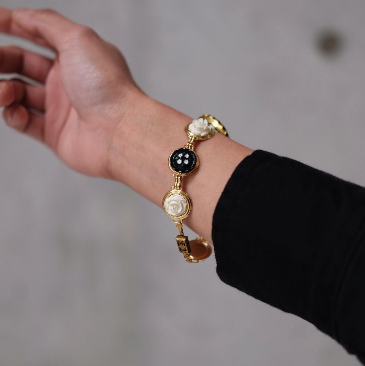 materials: 真鍮、ドイツ ヘマタイト インレイ カボション、ドイツ製手描きガラスカボション、ヴィンテージ フラワー セルロイド