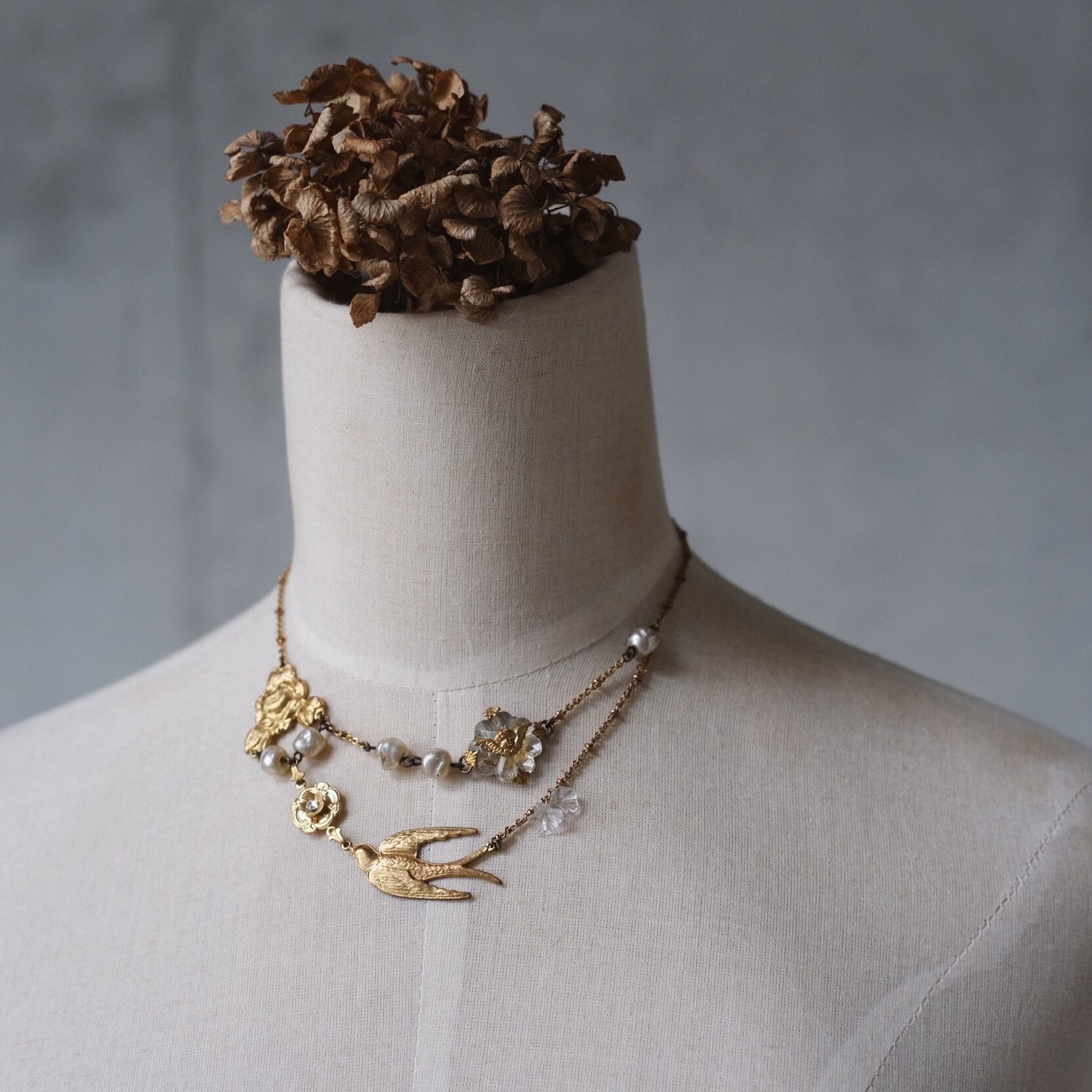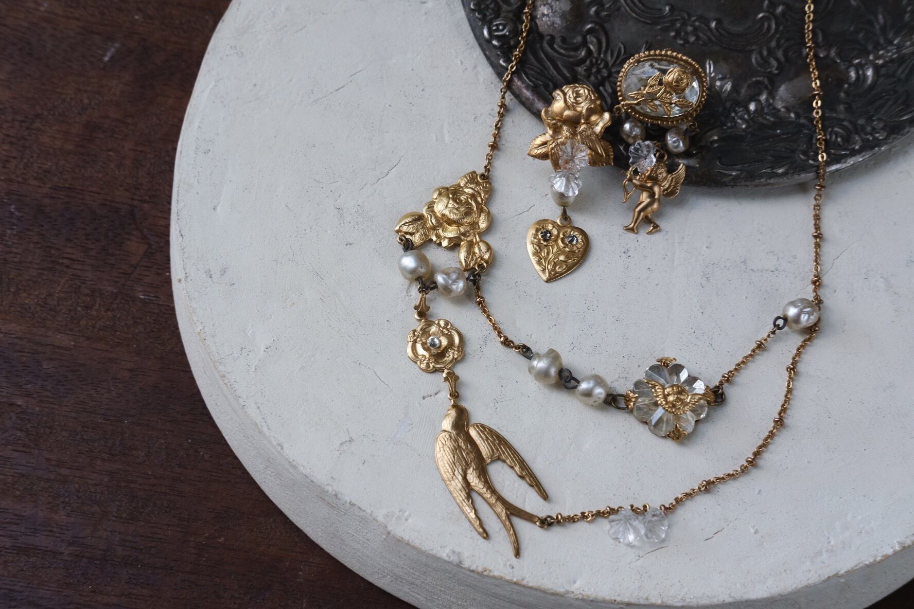 materials: 真鍮、Japan ヴィンテージ ガラスパール、ヴィンテージ チェコ ガラスカボション、