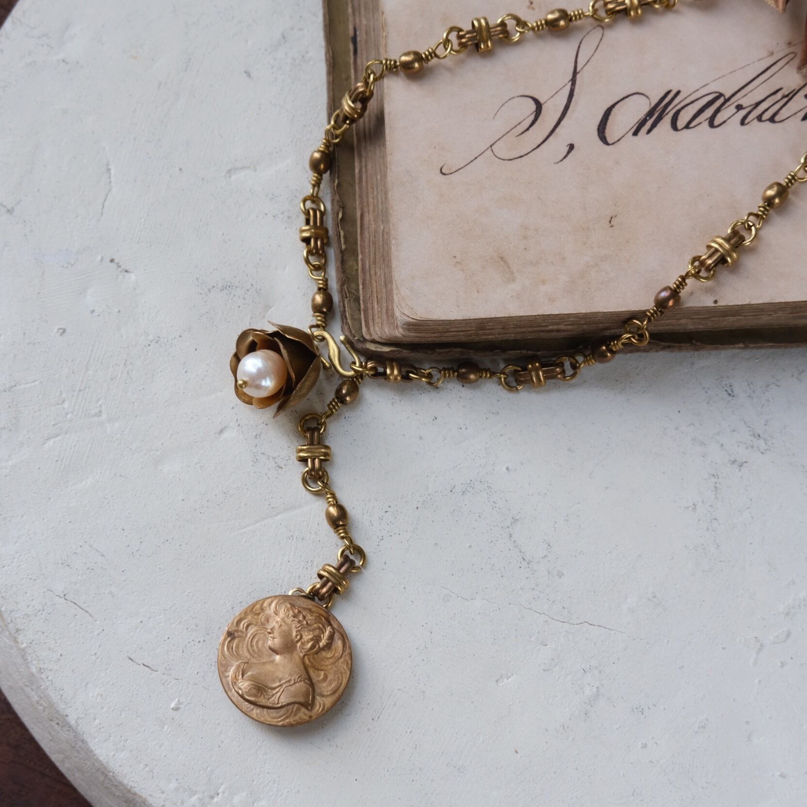 materials: 真鍮、ヴィンテージ Miriam Haskell 真鍮カメオ、ガラスパール