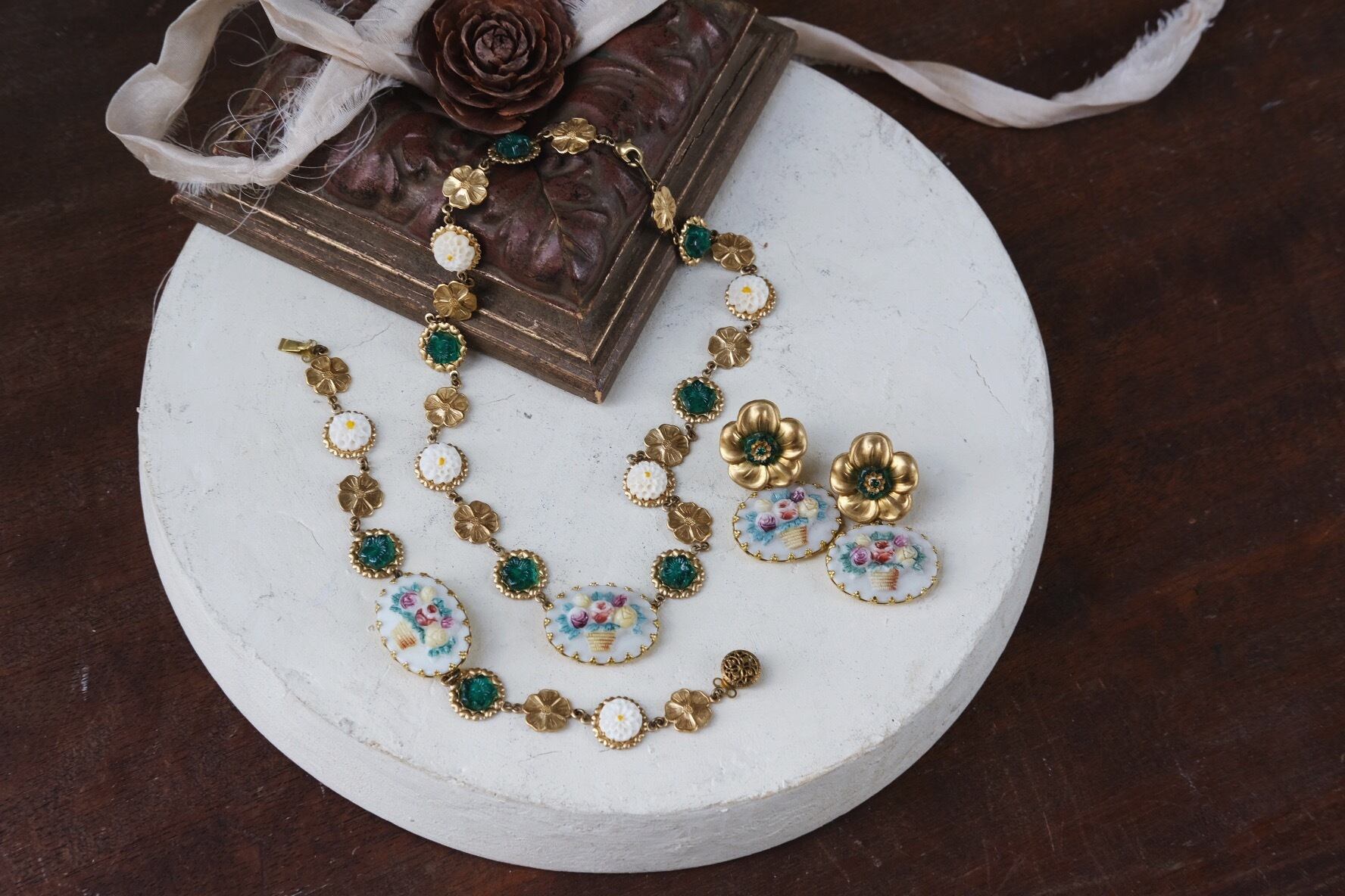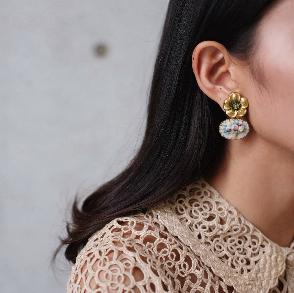 materials: 真鍮、ヴィンテージドイツ手描き花カゴ、チェコ エメラルドフラワー