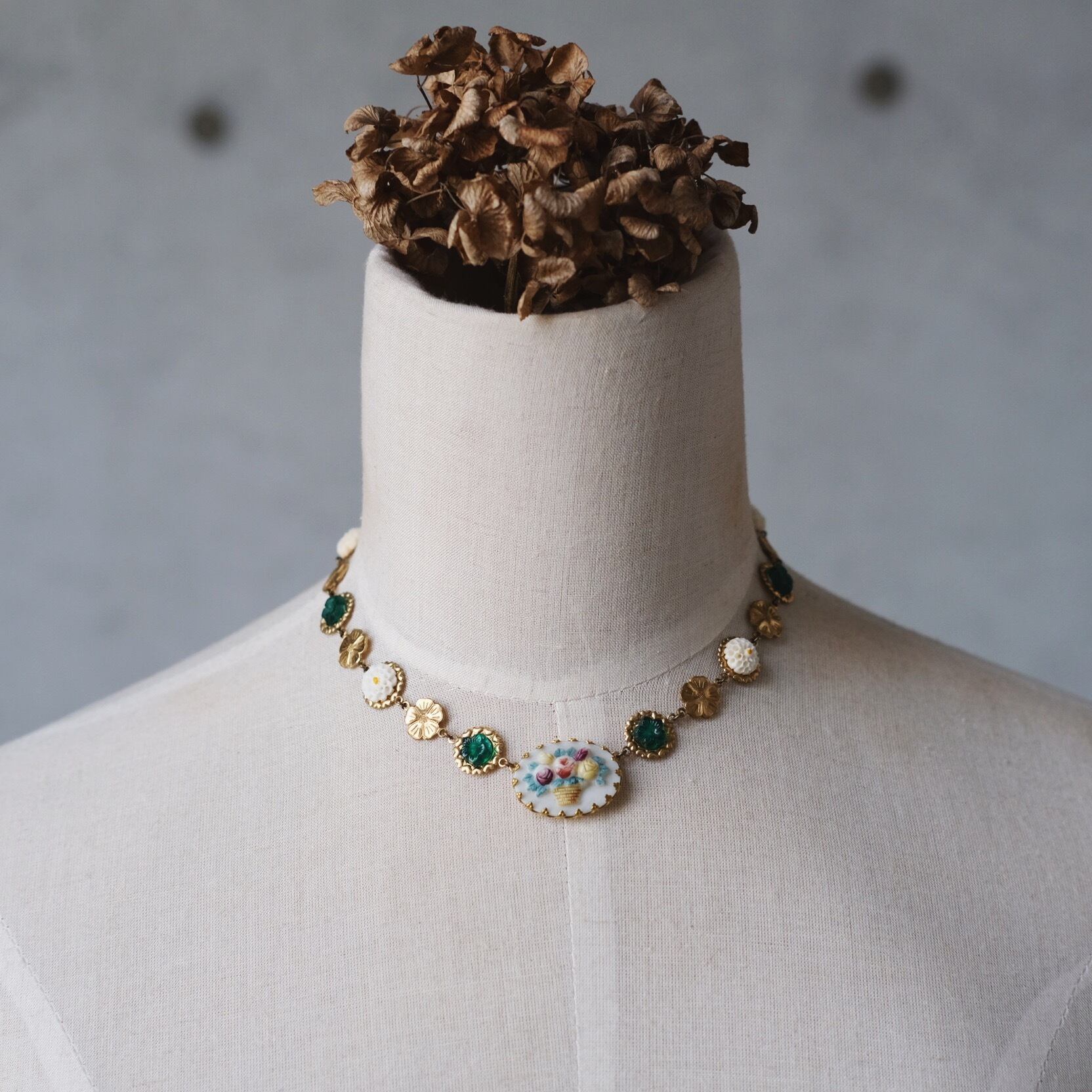 materials: 真鍮、ドイツセルロイド白・黄色 フラワー、ヴィンテージドイツ手描き花カゴ、チェコ エメラルドフラワー