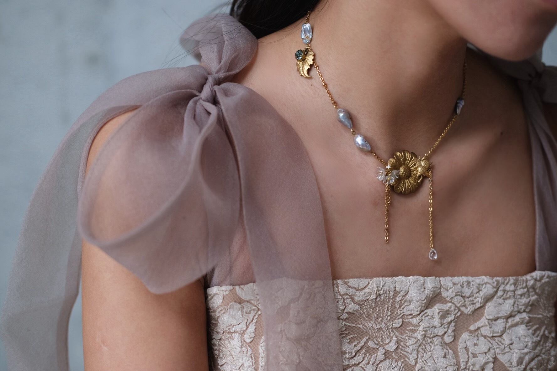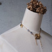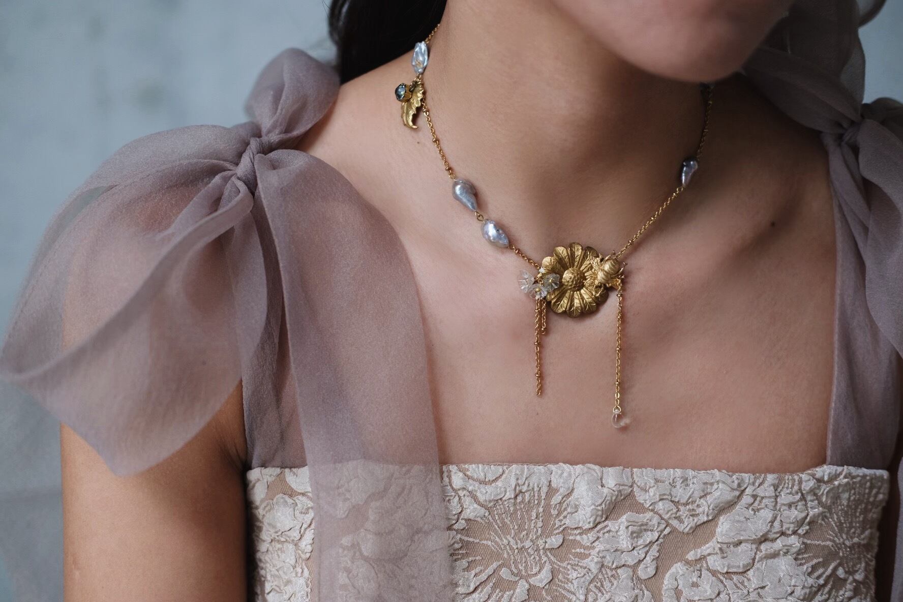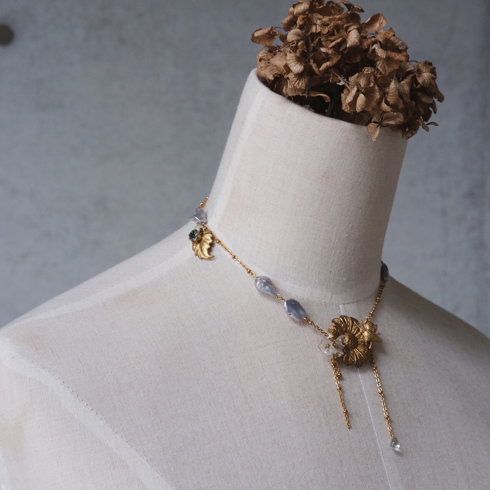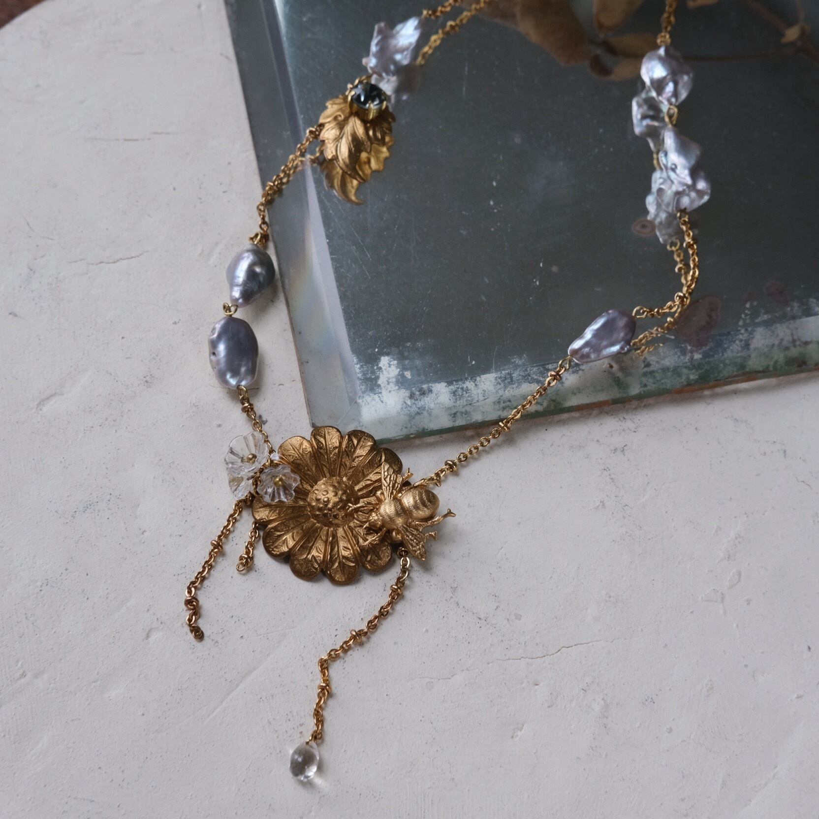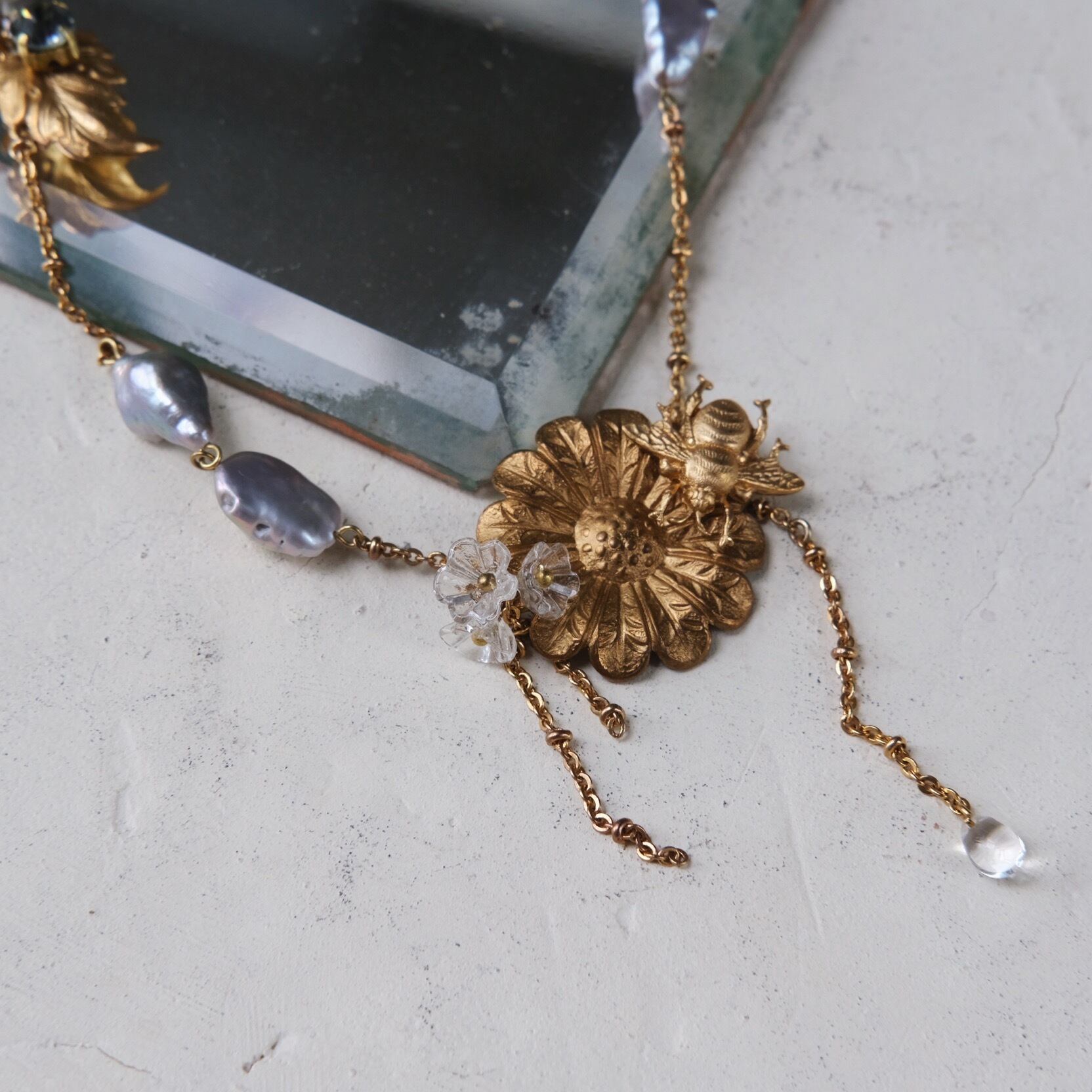materials: 真鍮、Miriam Haskell 真鍮フラワー、淡水バロックパール、ガラスフラワー