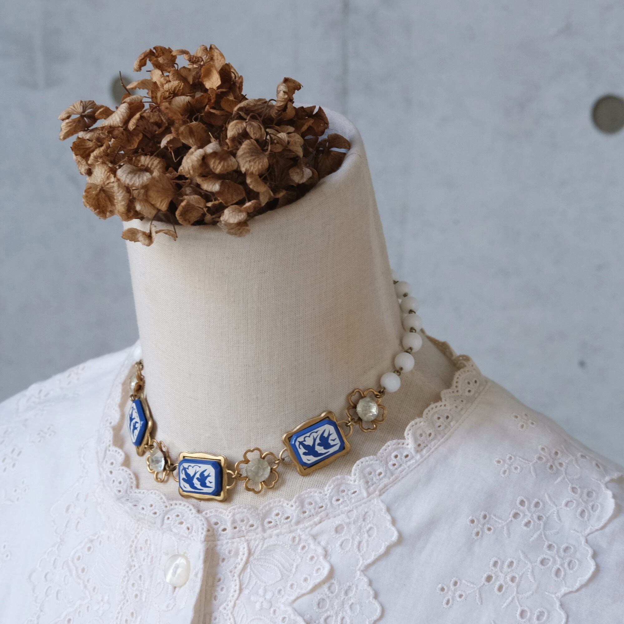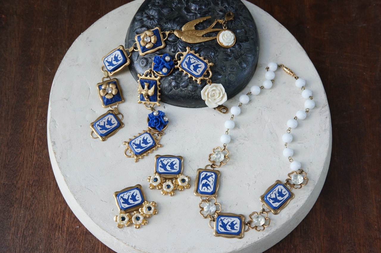 materials: 真鍮、ドイツ製ガラスカボション、チェコガラスストーン、ヴィンテージ ミルクガラスビーズ
