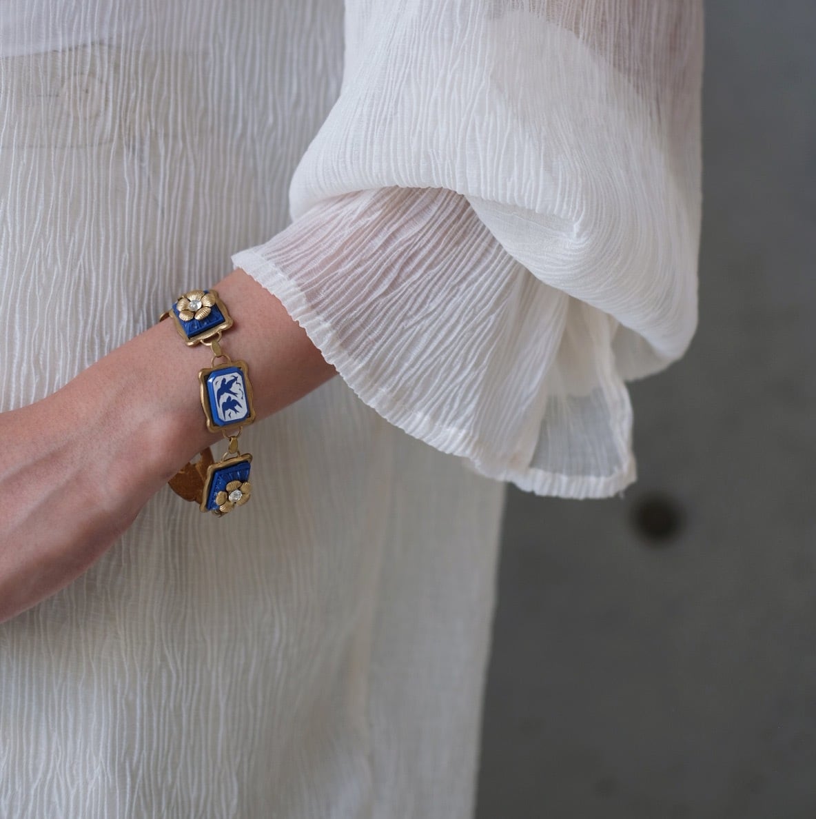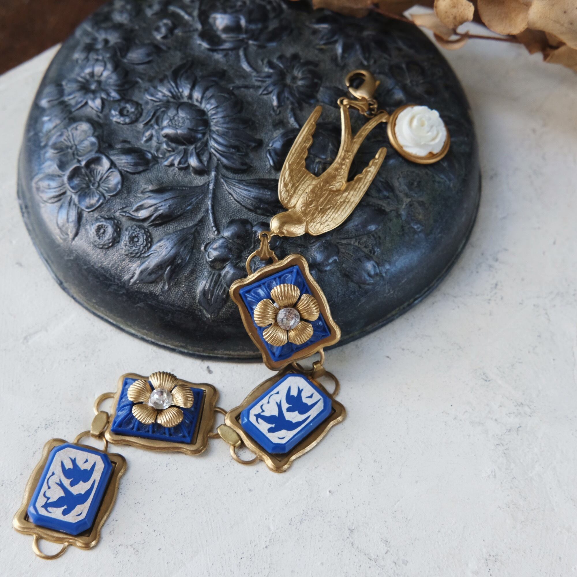 materials: 真鍮、Lapis Lazuli、ドイツ製ガラスカボション、セルロイドフラワー、チェコガラスストーン