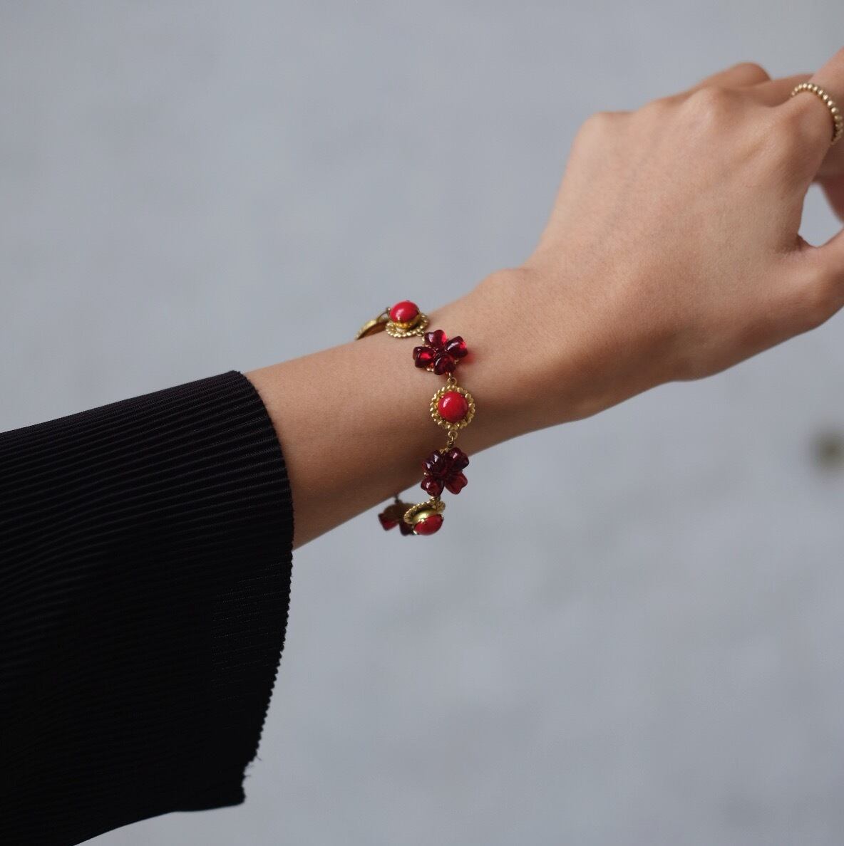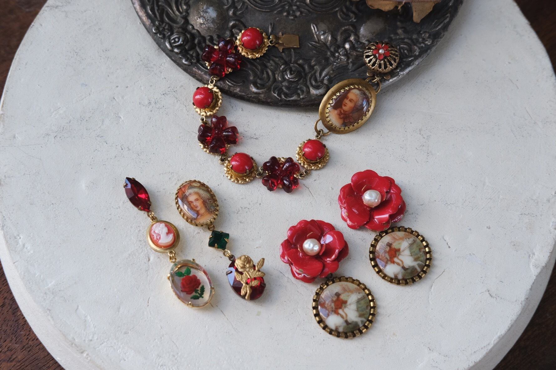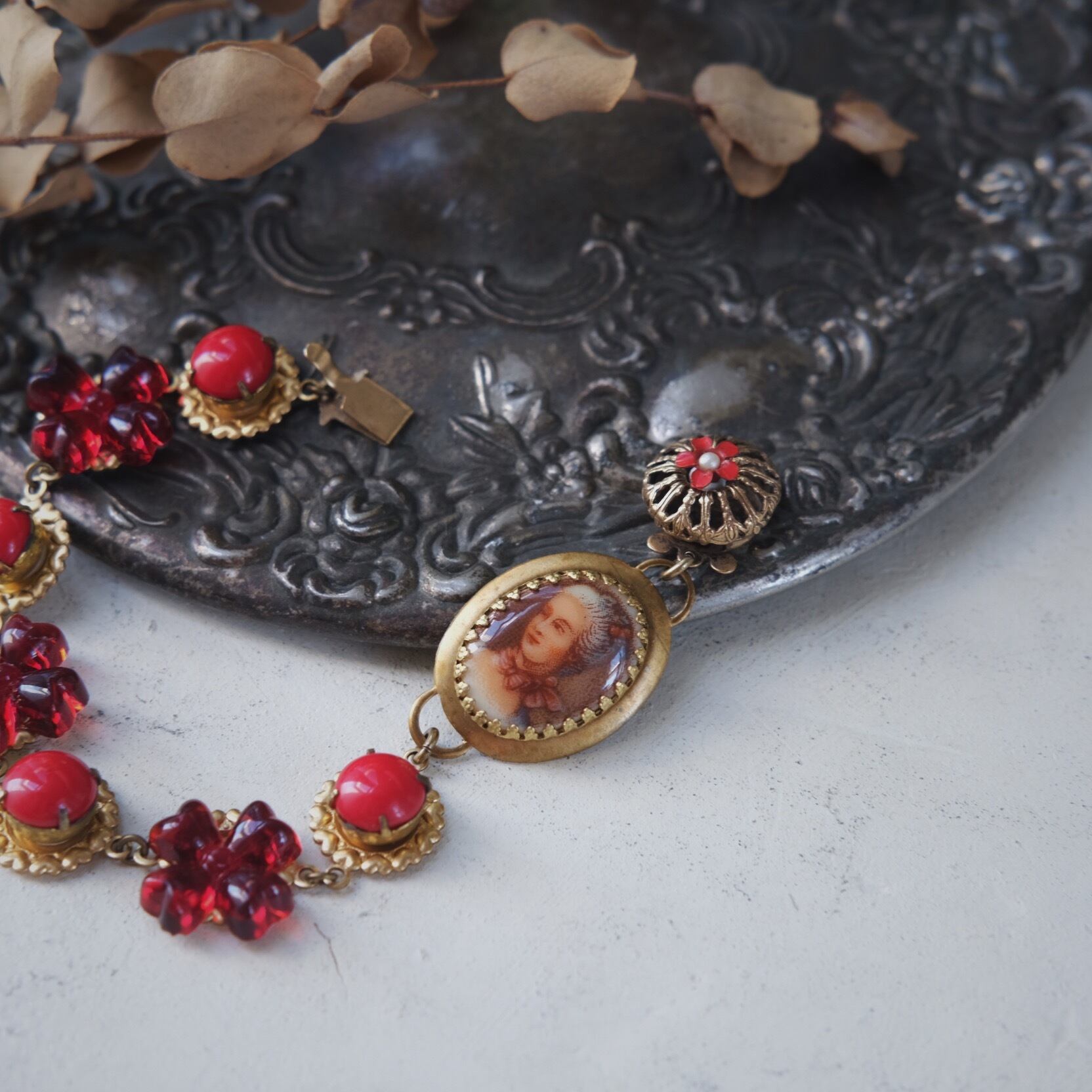 materials: 真鍮、ドイツ ガラス カボション、ヴィンテージ ガラス 赤ストーン