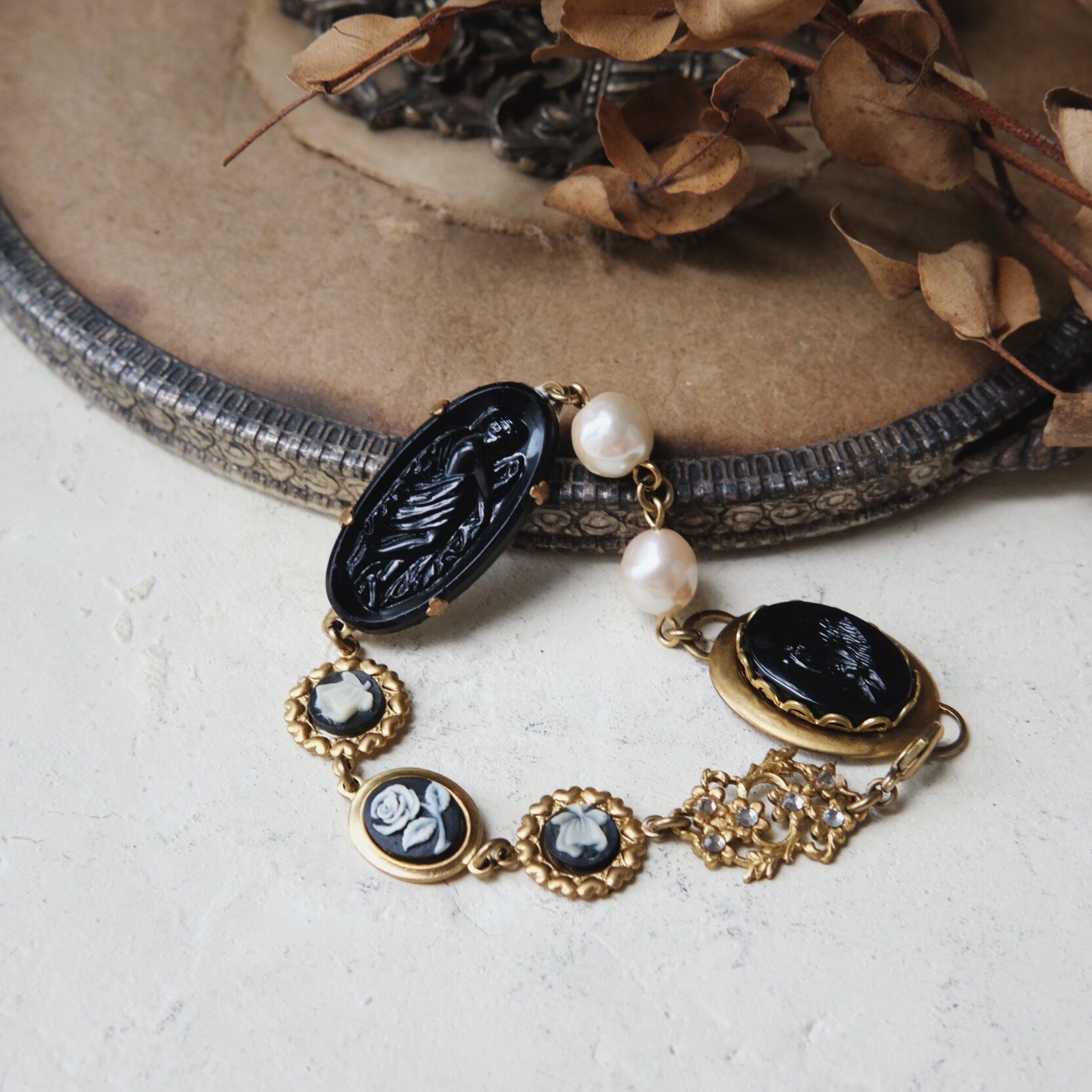 materials: 真鍮、ドイツ ガラスカボション / カメオ、ヴィンテージ バロック ガラスパール、スワロフスキー