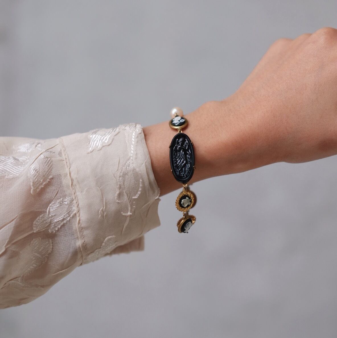 materials: 真鍮、ドイツ ガラスカボション / カメオ、ヴィンテージ バロック ガラスパール、スワロフスキー