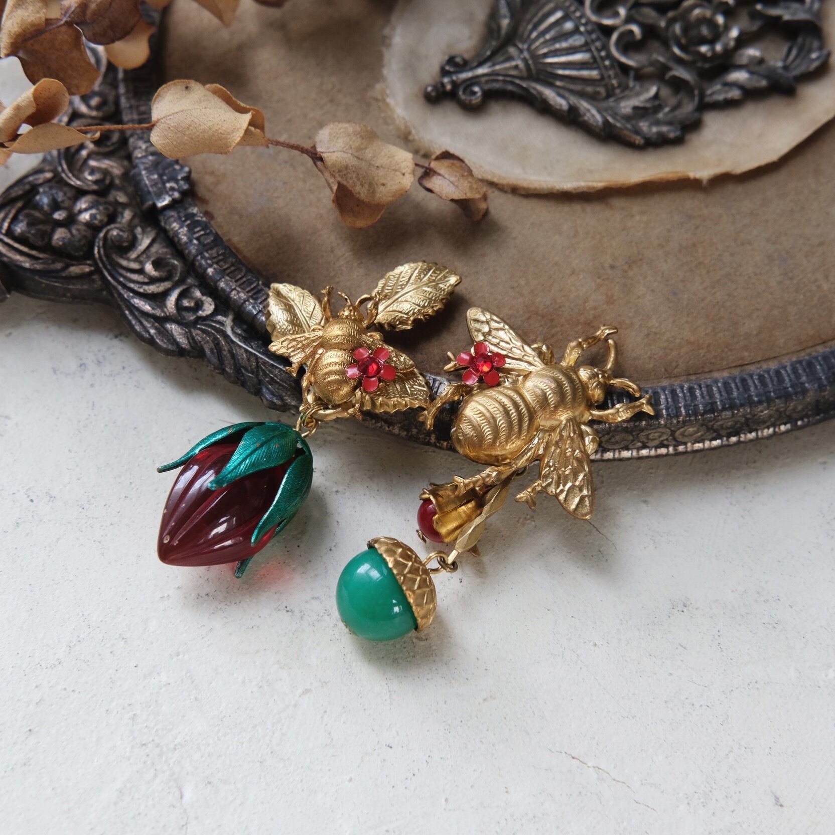 materials: 真鍮、U.S 50s rosebud ビーズ、Miriam Haskell 緑ガラス ビーズ