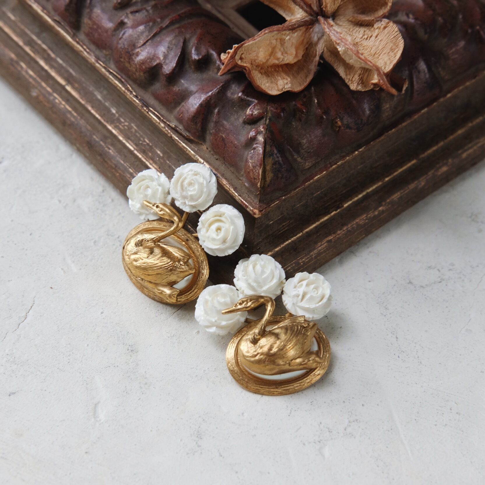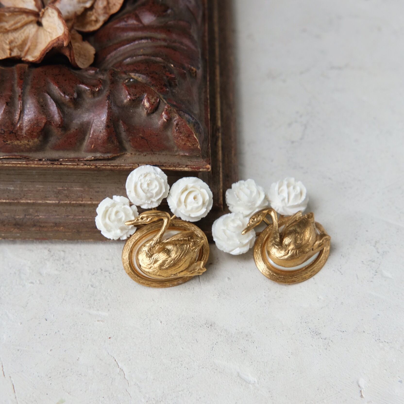 materials: 真鍮、ヴィンテージ セルロイド バラ カボション、ヴィンテージ ガラスパールカボション