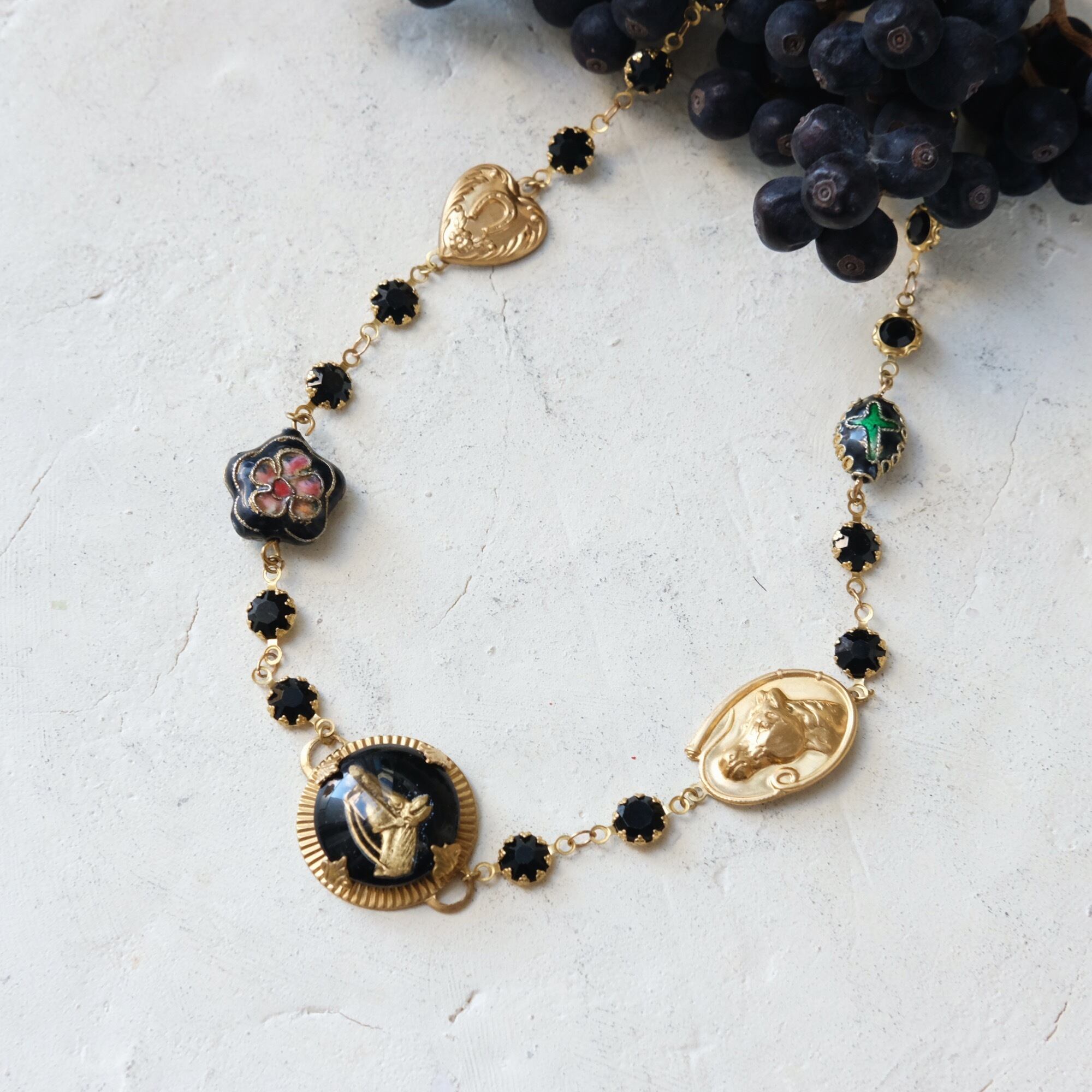 materials: glass beads brass chain, Germany intaglio, Cloisonne charm, brass charms